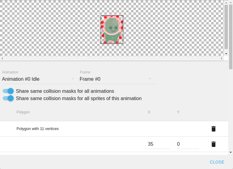 This will take you to the screen where you can enter/drag the outline of your collision mask. To add more points, click on the + sign below all the coordinates of your points. My final sprite collision masks look as shown below.